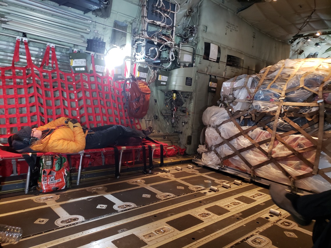 As a team we have been working out our “traveler muscles” for the last week while we wait for good enough weather to travel. This looks like reps of “patience” and “showing up on time” while maintaining good humor. You can see Erin’s patience pose in the photo below! You can also see one of our three large pallets of cargo. It is hard to travel light when we have to bring everything for living as well as all of our gear for science.